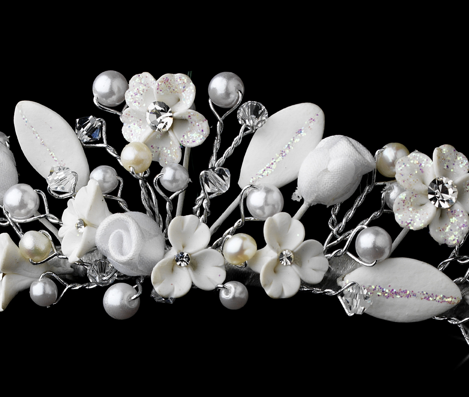 A fantasy of white porcelain and fabric flowers, this piece is perfect for your classic wedding. Rhinestones, clear Swarovski crystals, and faux and freshwater pearls provide charming accents. The ornamented portion of the piece measures 9-1/4" wide and 1-1/4" tall at its center peak, and the piece ends in two loops that allow you to fasten it in your hair with bobby pins.